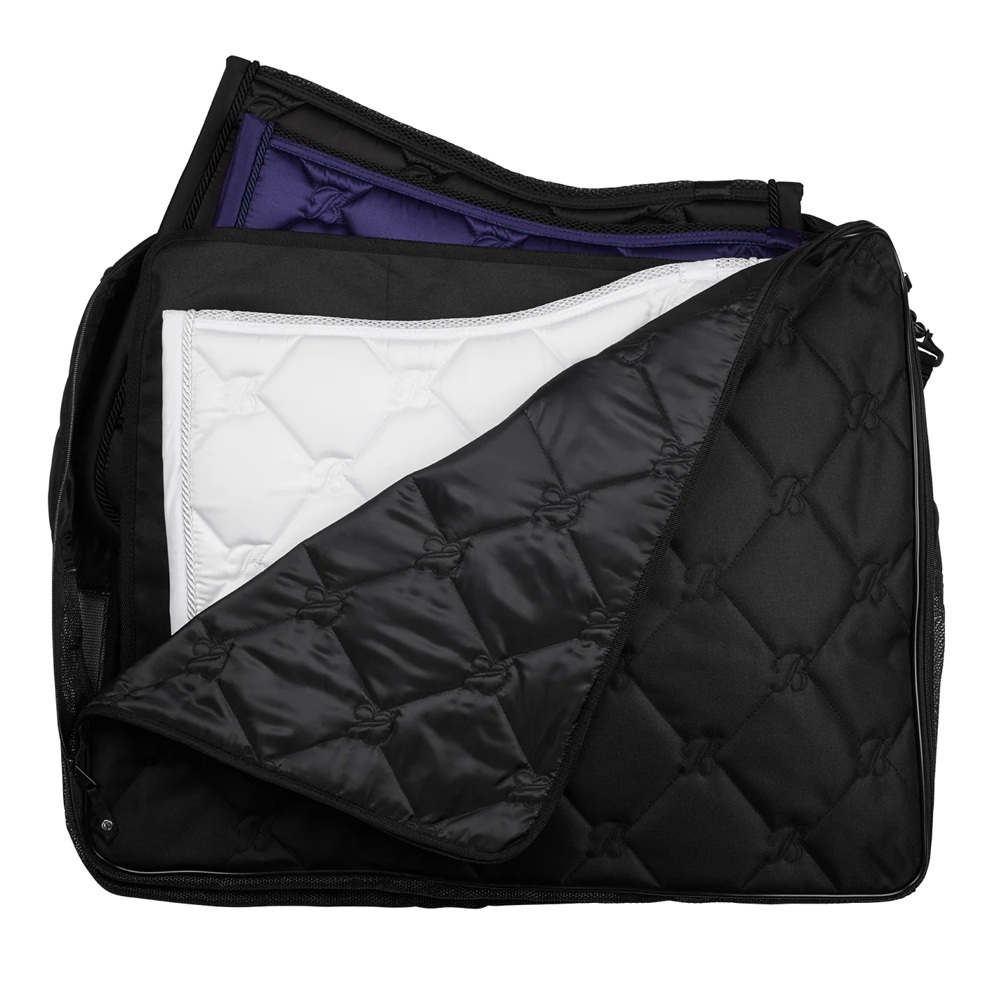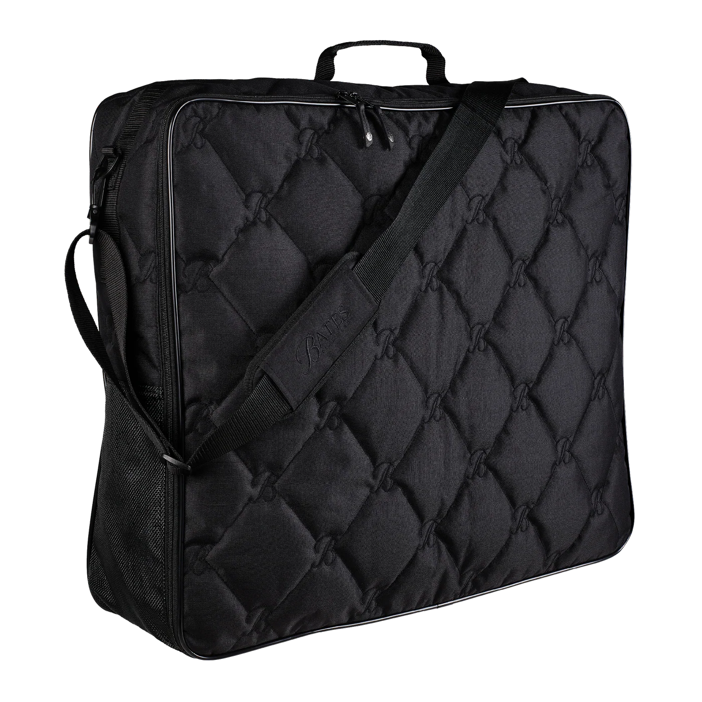 Generously sized to accommodate up to eight full-size saddle pads, numnahs or a lightweight rug, the bag features an internal divider flap to separate used items during events or travel. Finished with distinctive Bates “B” quilting, leather zip pullers, and high-quality fittings, this bag reflects the craftsmanship and attention to detail synonymous with Bates Saddles.