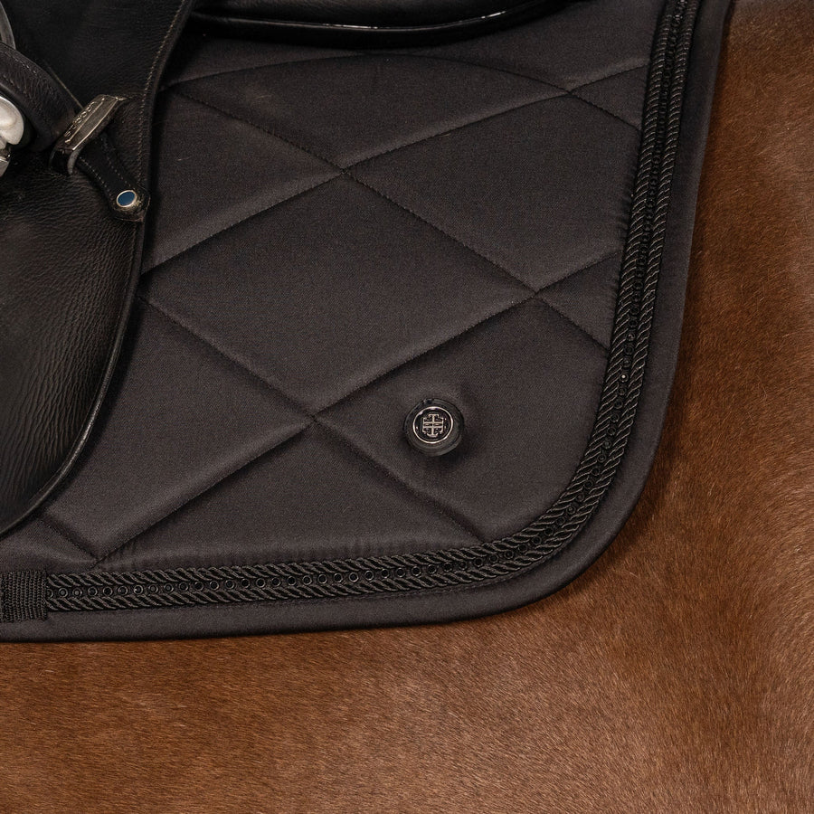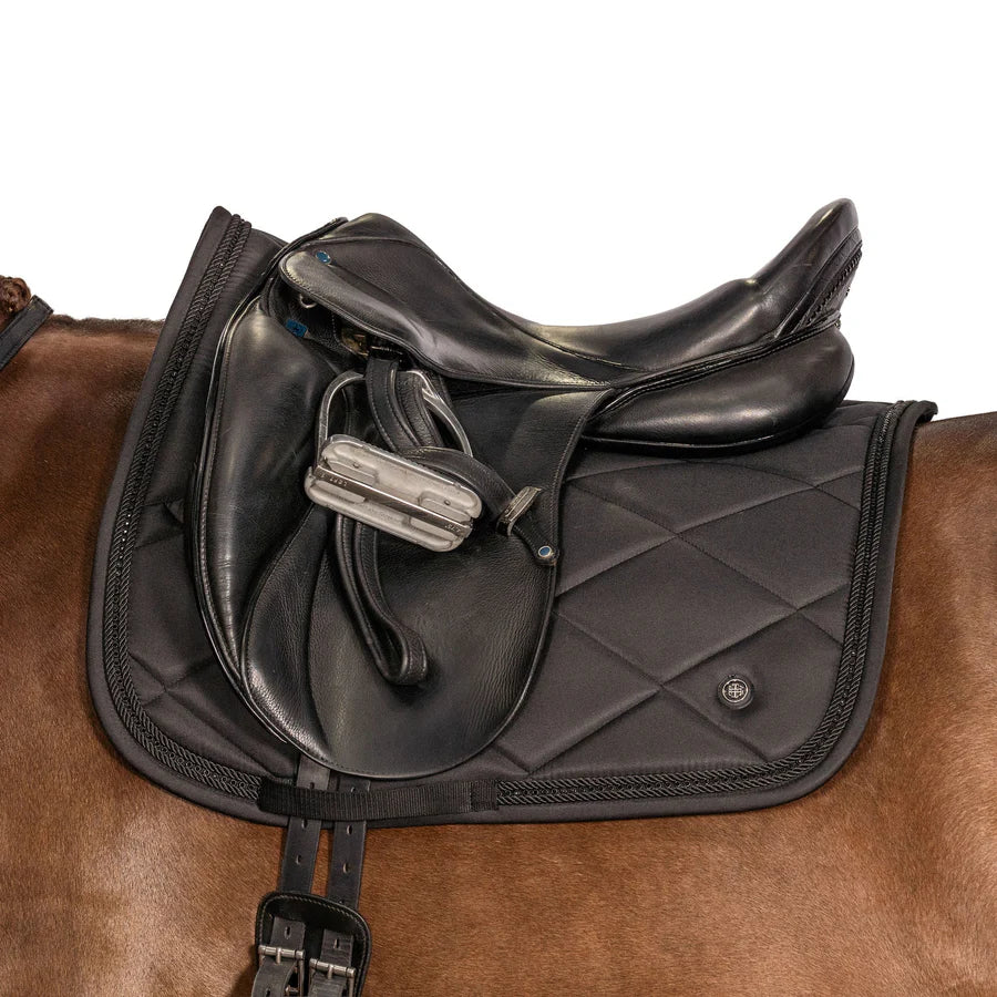 This ultra soft dressage saddle pad is the ultimate in comfort for your horse. Super soft cotton waffle weave lining and eco fill offer natural breathability. The classic black pad is accented by a complimentary diamond quilt. Black LT enamel badge with black rubber backing. \