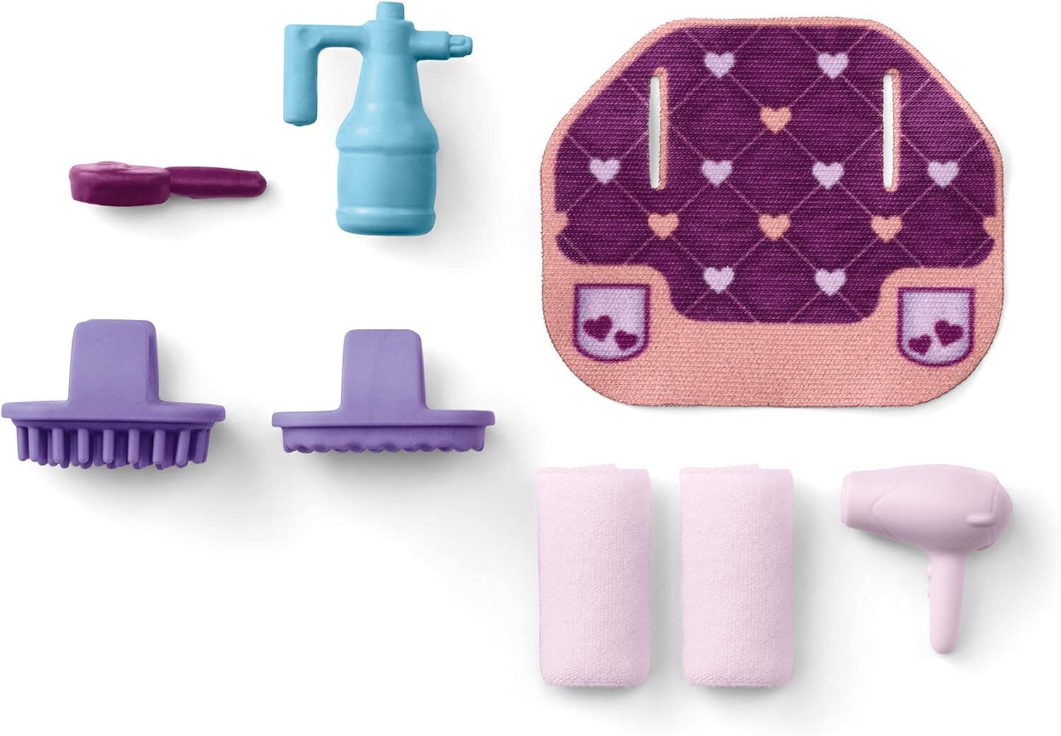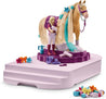 Contains: 1x Beauty Horse, 1x human figure, 1x horse grooming station, 1x drawer, 12x hair clip, 14x hair pearl, 4x hair flower, 4x hair bow, 1x finger comb, 1x finger sponge, 1x hair brush, 1x hair dryer, 1x horse blanket, 1x vest, 1x hair strand, 4x gaiters, 1x bracelet