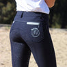Euro leg (1/2 sock) jean style jodhpurs, belt loops, 2 back zips and signature embroidery in silver.