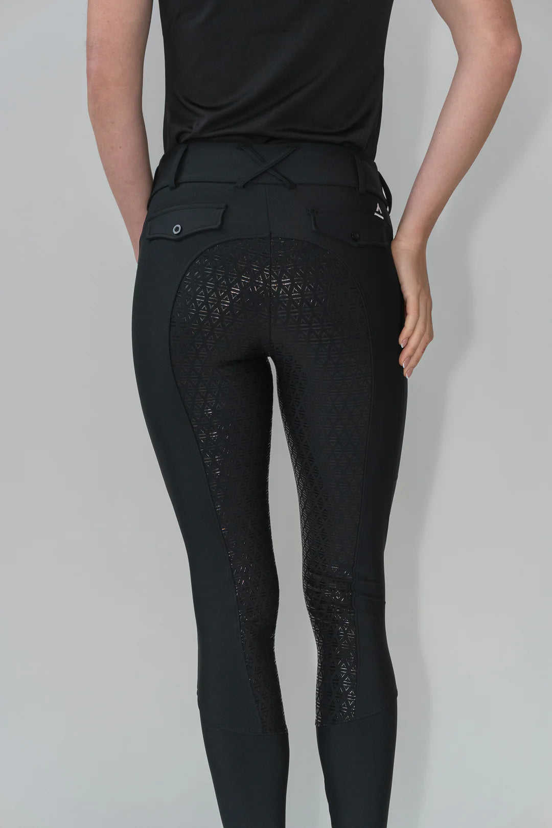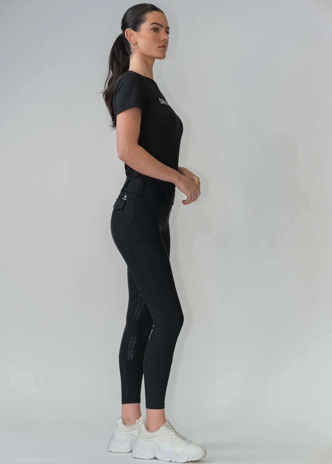 Designed with a high waistband for a secure, flattering silhouette, these breeches feature decorative back pockets, a practical phone pocket, a full silicone seat for added grip, and embroidered logos on both sides for a polished finish.